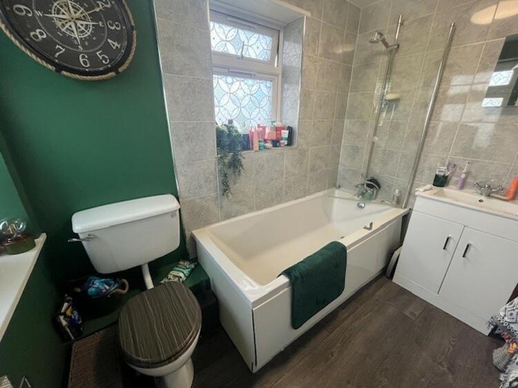 With low flush w.c. wash hand bason and panel bath with shower over. Heated towel rail and window to side and rear.