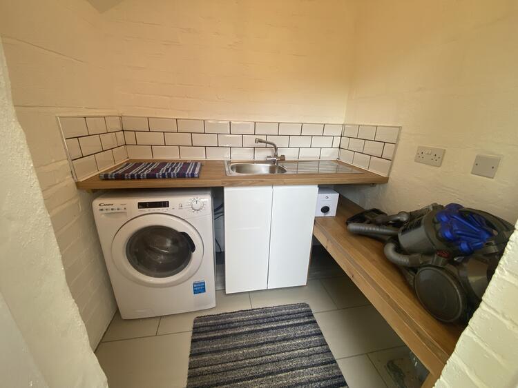 With washing machine, worktop with stainless sink fully tiled floor and tiled splashback.