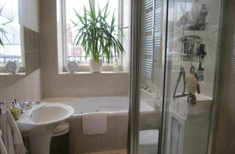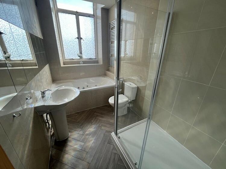 Comprising of a four piece suite including wash hand basin, low flush wc, large jacuzzi bath and separate double shower cubicle. Tiled flooring, part tiled walls, heated towel rails and window.
