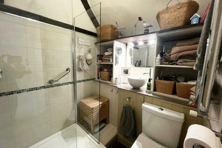 Bespoke fitted unit with shelving, lighting, mirror and freestanding bowl basin and mixer tap, WC, walk-in double shower enclosure, chromed heated towel rail, original exposed beams.