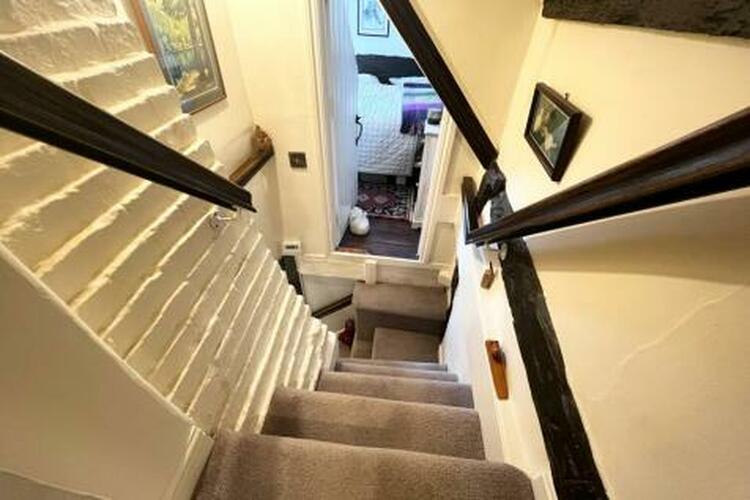 Split level dog legged staircase, two floor to ceiling storage cupboards with storage baskets, original exposed beams and attractive brickwork and doors off to;