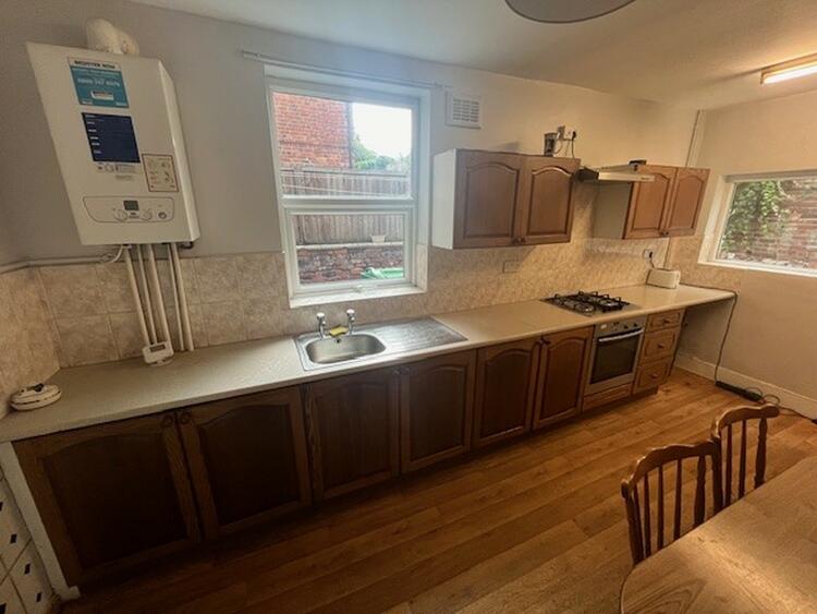 Having base and wall units, sink inset into work surfaces, built in oven, hob and extractor. Wall mounted combi boiler, windows to side and rear and door to back garden.