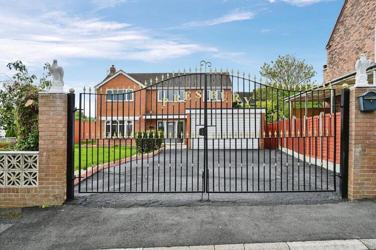 Gated entrance with multi-car driveway, gardens to three sides.
