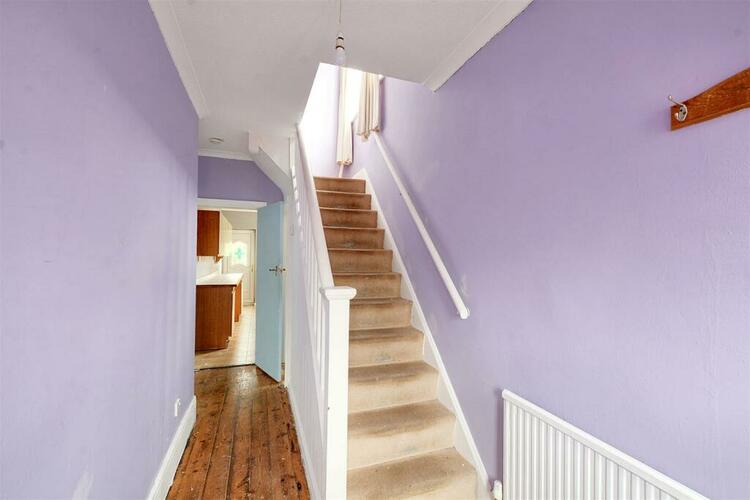 A double glazed door leads through to entrance hall with wooden flooring, radiator and access to under stairs storage cupboard.