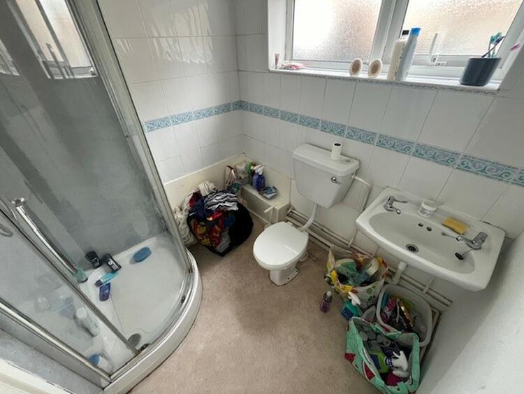 Having a white suite comprising low flush WC wash hand basin and corner shower cubicle. Part tiled walls and window to front.