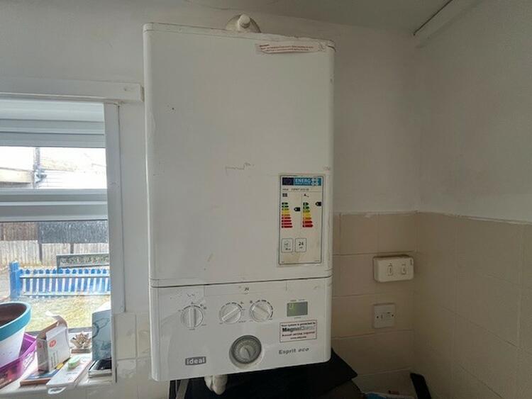 With base and wall units, sink, space for appliances, wall mounted boiler and window to front.