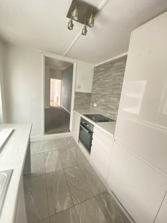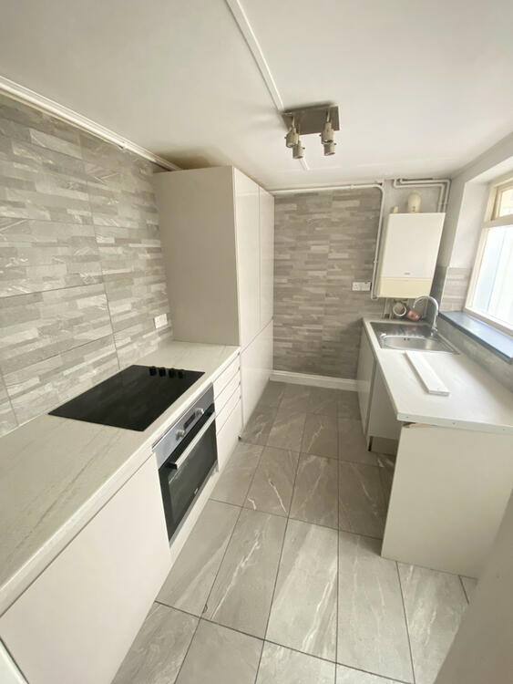 Modern fully fitted neutral kitchen including integrated fridge/freezer, electric oven, ceramic hob and stainless steel sink. Slate effect wall tiles along with marble effect floor tiles.