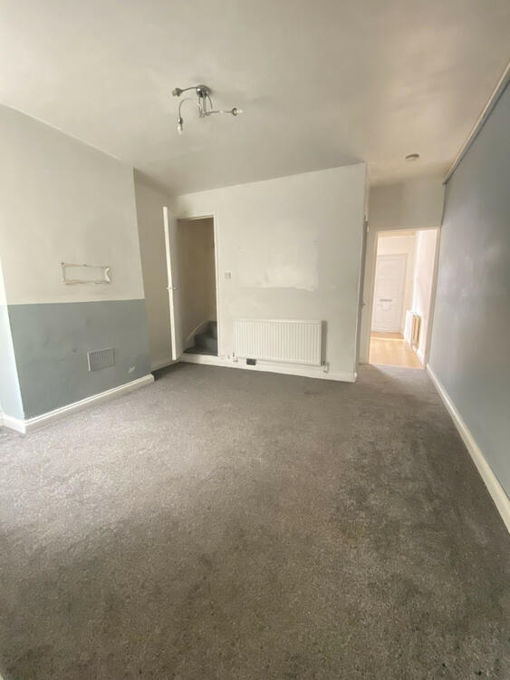 Grey carpets, neutral decor, double radiator and understairs storage cupboard.