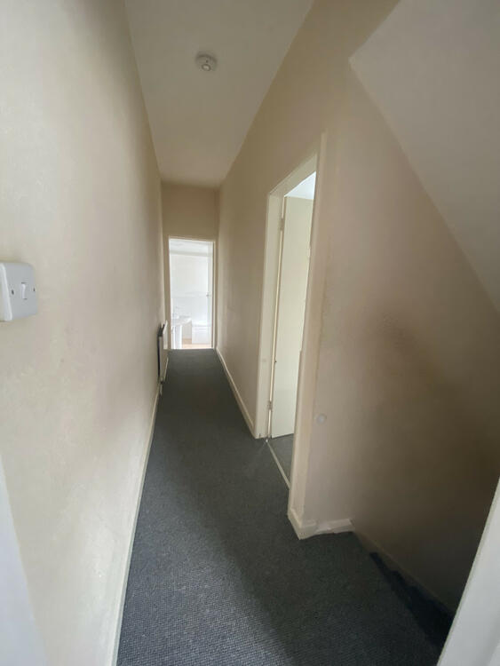 Grey carpet, neutral decor, radiator and over stairs storage cupboard.