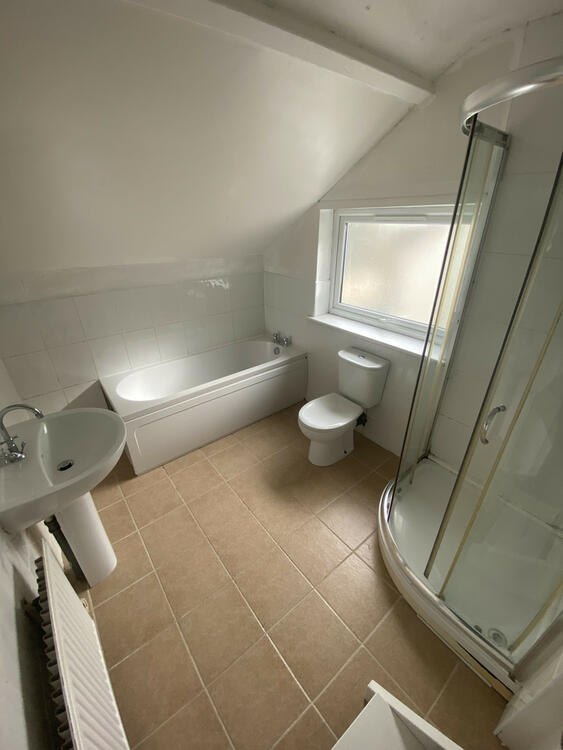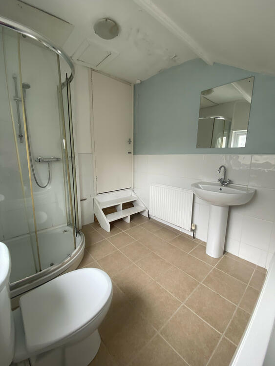 Newly fitted white three piece suite, with freestanding mains corner shower, tiled flooring, neutral decor and white low level wall tiles. PLEASE NOTE YOU STEP DOWN INTO BATHROOM.