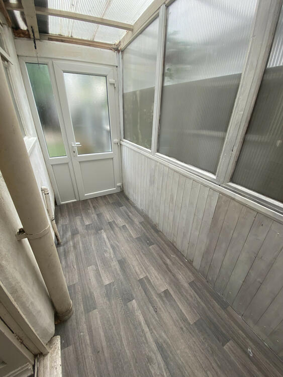 Grey wood effect vinyl flooring, with uPVC double glazed rear door leading to enclosed garden.