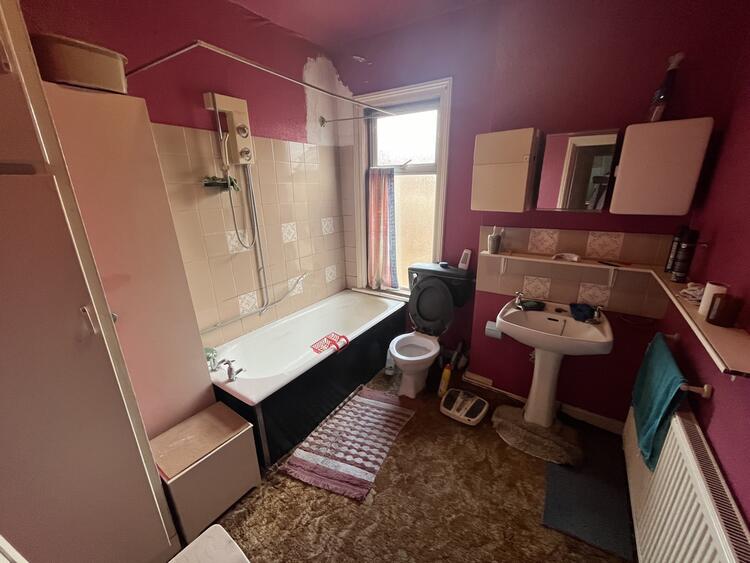 With low flush w.c. wash hand basin and bath with shower over. Airing cupboard, radiator and window to rear.