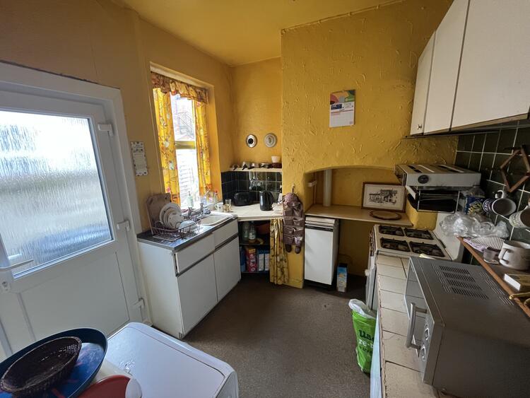 With base and wall units, sink, space for appliances, boiler, which is currently not working, window to side and UPVC door to rear garden.