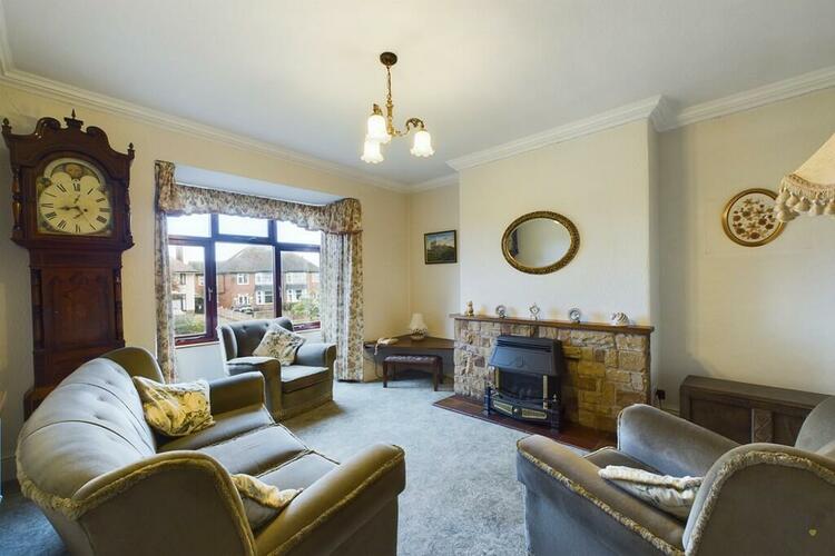 The sitting room has a fireplace with coal effect gas fire with tile hearth and square bay window to front.