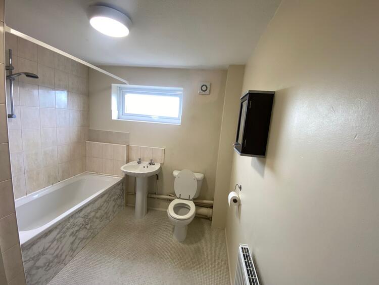 White three piece suite with shower over bath, extractor fan, neutral decor, tile effect vinyl flooring and radiator.