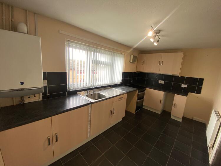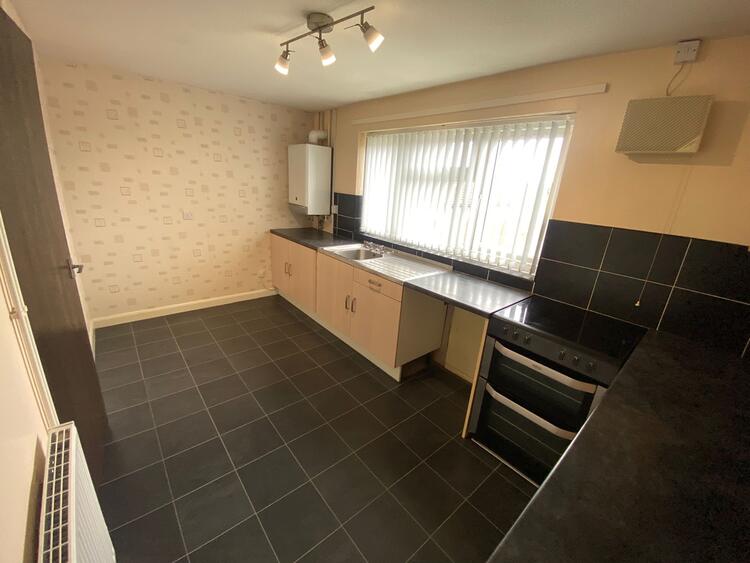 A range of wall and base units, freestanding cooker, stainless steel sink, black tile effect laminate, neutral decor and radiator.