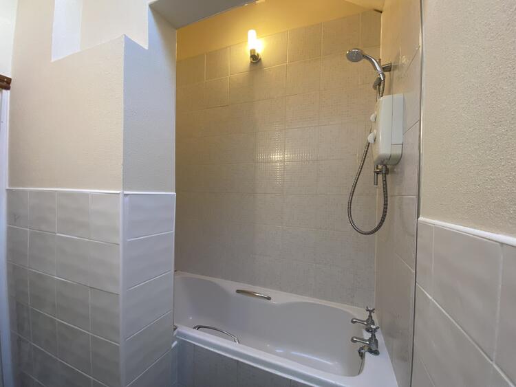 The property features a bathroom with a white suite, an electric shower, and a skylight, along with a bright living room that showcases a skylight and original wooden beams. The modern kitchen is equipped with integrated appliances. The second bedroom, conveniently located on the ground floor, is perfect for use as an office, while the main bedroom on the first floor offers stunning views. Outside, you will find a patio area.