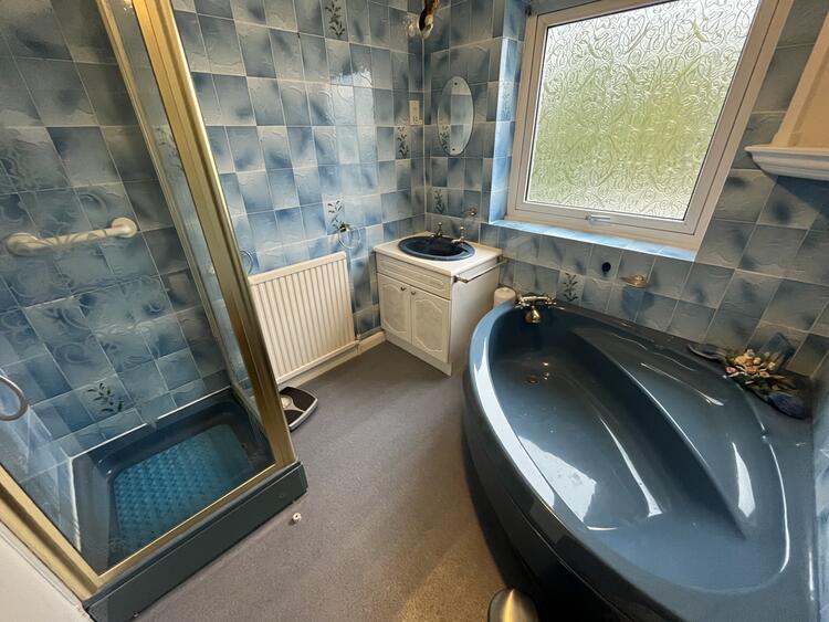 Having low flush wc, wash hand basin, corner bath and separate shower cubicle. Window to rear.
