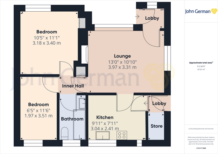 Entrance lobby, lounge, kitchen, rear lobby with store. Inner hallway, bedroom one, bedroom two and bathroom.