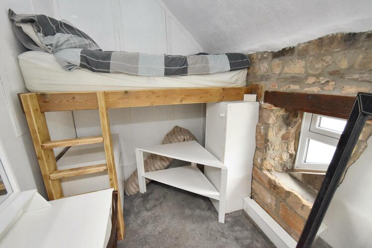 With exposed stone wall, cupboard and access to roof space.