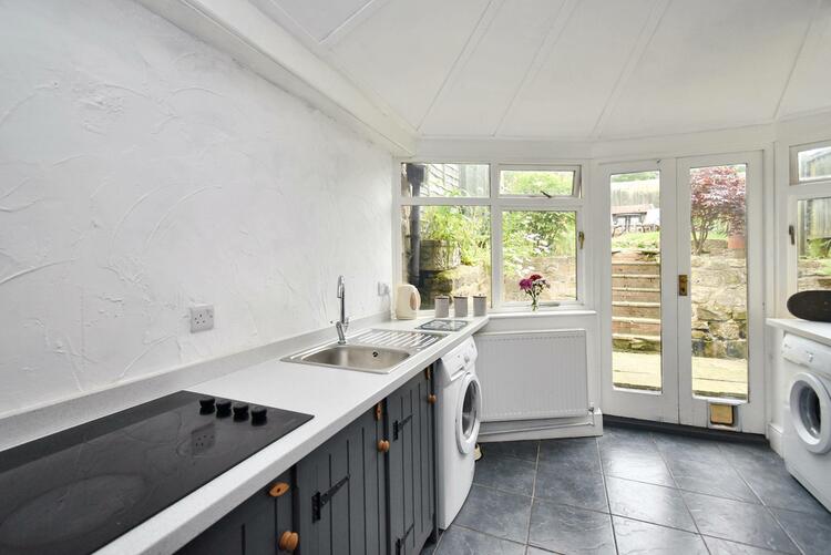 With single stainless steel sink unit with mixer tap, fitted worktop, fitted base cupboard, built-in four ring electric hob, built-in electric oven, plumbing for automatic washing machine, radiator, sealed unit double glazed window to rear and sealed unit double glazed French doors opening onto private enclosed rear garden.
