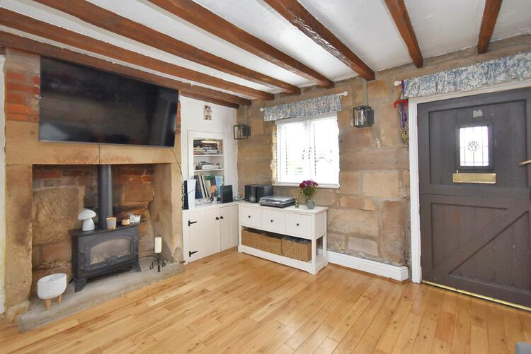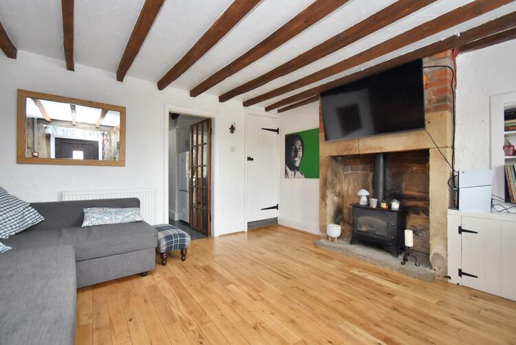 3.85m x 3.64m (12ft 7 x 11ft 11) - With exposed brick and stone fireplace with raised stone hearth, solid wood flooring, beams to ceiling, two exposed stone walls, stable entrance door with inset window with leaded finish, radiator and double glazed window with pleasant views to front and fitted blind.