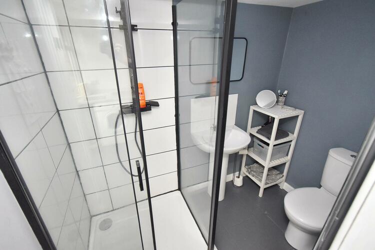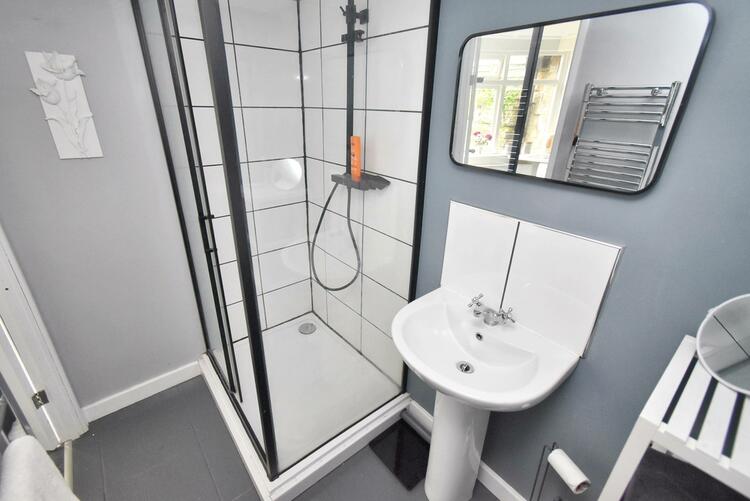 2.28m x 1.38m (7ft 5 x 4ft 6) - With double shower cubicle with shower, pedestal wash hand basin, low level wc, tiled splash-backs, tiled flooring, extractor fan, heated chrome towel rail/radiator and internal panelled door.