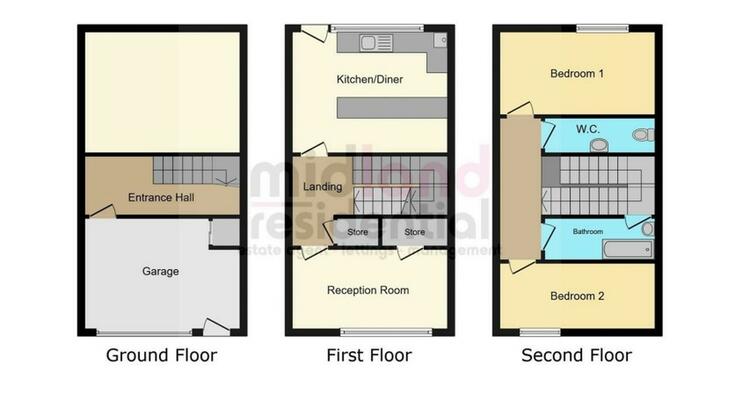 Accessed through a secure entrance through an enclosed garage area, with a door leading to the entrance hallway. Stairs to the first-floor landing, leading thereof: reception room, enclosed store room, kitchen diner with UPVC door, access leading to the rear garden, stairs leading to the second-floor landing, leading thereof: two bedrooms, bathroom and WC.