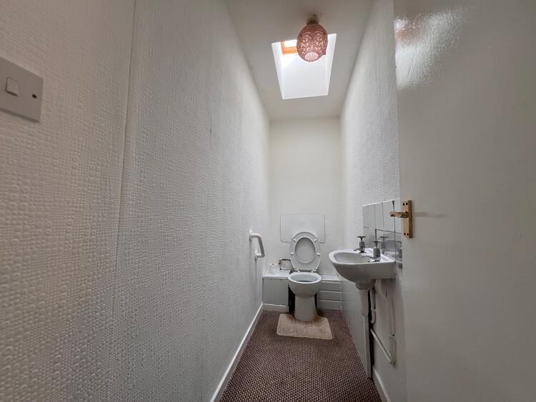 Vinyl flooring, low level WC, ceiling light point, timber framed roof light window.