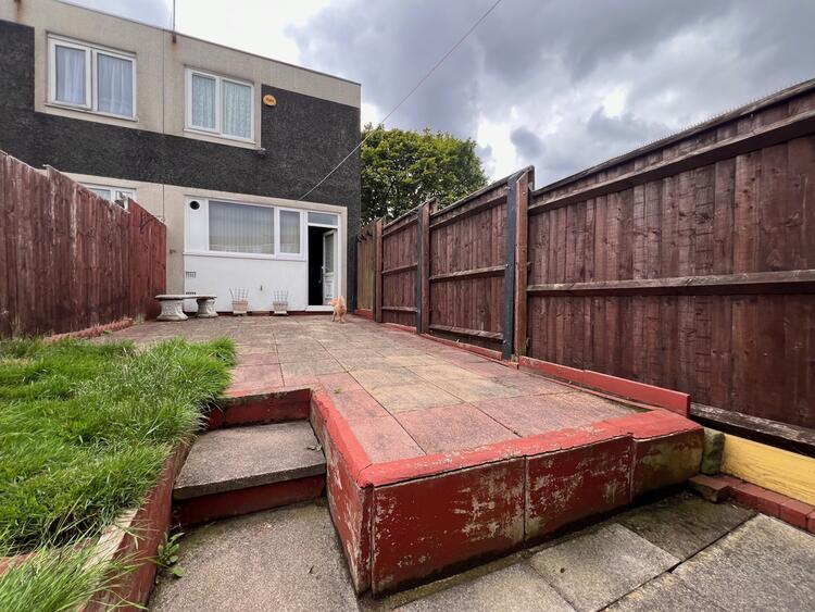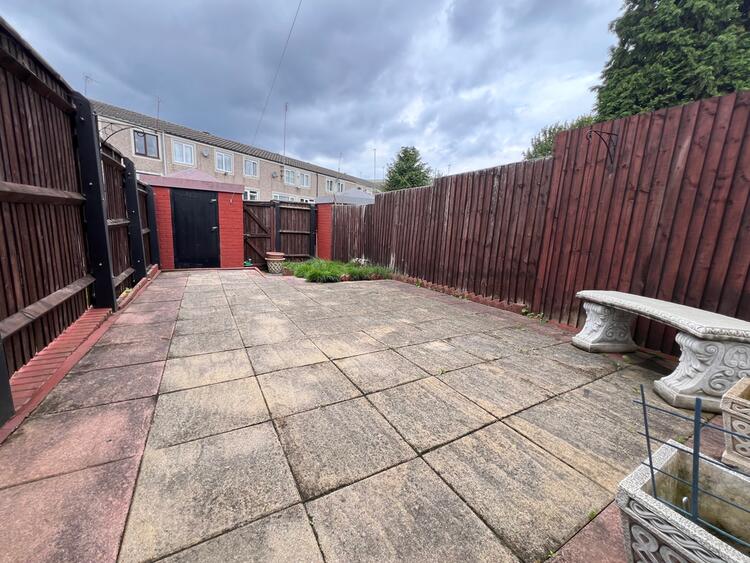 Raised slabbed area, with a brick built outbuilding, with gated access to the rear.