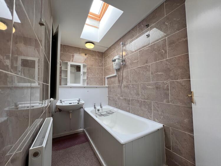 Vinyl flooring, bath with electric shower over, part splashback wall tiles, wash hand basin with taps over, door leading to enclosed storage space, ceiling light point, mechanical extractor fan, timber framed roof light window.