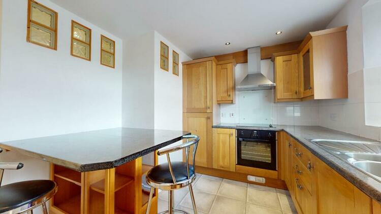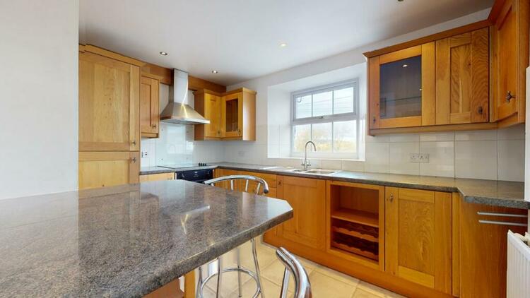 Fitted with a modern range of base and wall mounted cupboards and drawers with solid oak panelled door and drawer fronts, contrasting stone effect working surfaces to include a three person breakfast bar, inset one and half bowl stainless steel sink with mixer tap, inset four ring electric hob together with stainless steel extractor hood and light above, integrated oven, fridge and freezer, open shelving/wine rack, glazed display cupboard, tiled splashbacks, tile effect vinyl floor finish, double glazed window with far reaching views across town towards the River Dee and panelled radiator.