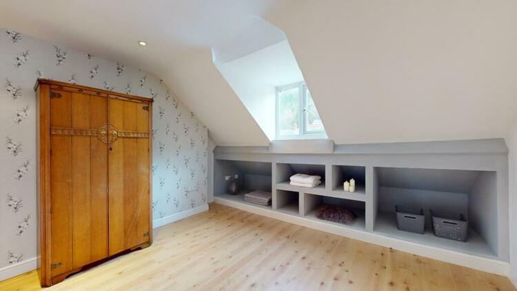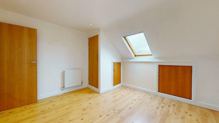 Partially vaulted ceiling with large Velux roof light, fitted cupboard and under eaves stores, woodgrain effect floor finish, panelled radiator.