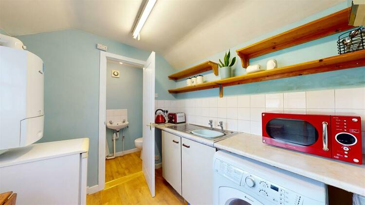 Fitted base unit with worktop and inset single drainer sink, void and plumbing for washing machine, wall shelving, tiled splashback, modern Worcester gas fired combination boiler providing hot water and central heating to both the ground, first and second floor accommodation. Panelled radiator.
