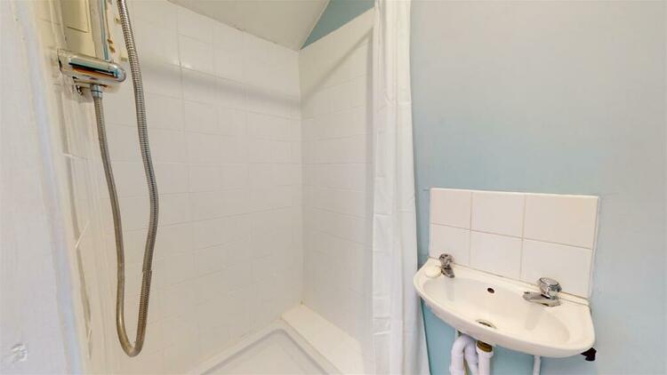 White suite comprising tray with tiled walls and electric shower over, wash basin with tiled splash and low level WC. Extractor fan.