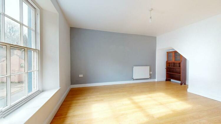 Vaulted ceiling with hipped window overlooking Bridge Street, fitted cupboard over the stairs, feature open shelving units to the lower eaves area, woodgrain effect floor finish, panelled radiator.