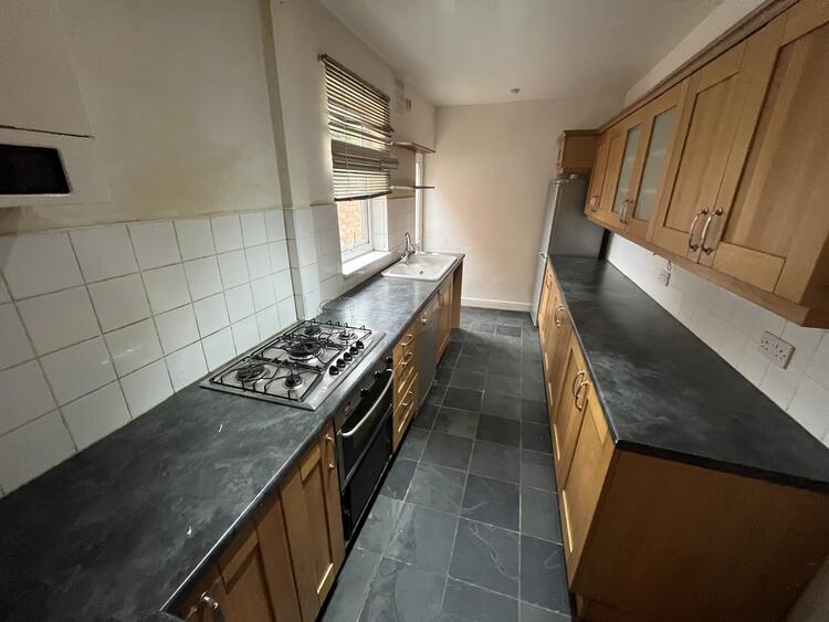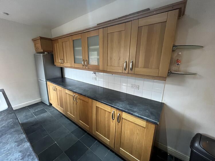 With base and wall units, sink, built in oven and hob. Ample work surfaces, wall mounted boiler, window to side and door to garden.