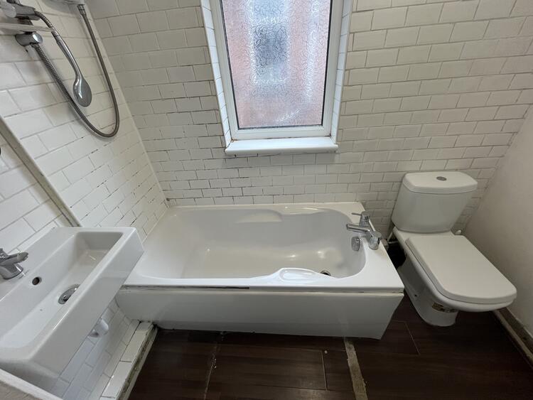 White suite comprising low flush w.c. wash hand basin and panel bath with electric shower over. Tiling to walls, heated towel rail and window to side.