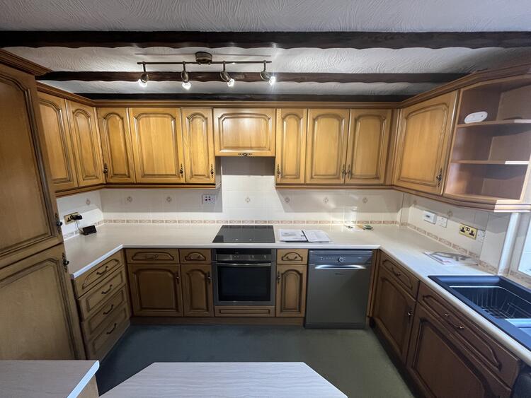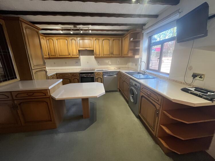With base and wall units, sink, work surfaces and integrated oven, hob and hood. Breakfast bar, dining area and window to rear.