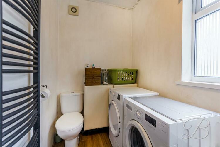 Versatile space consisting of a hand wash basin, low flush WC, space and plumbing for a washing machine/tumble dryer. With a window to the side elevation.