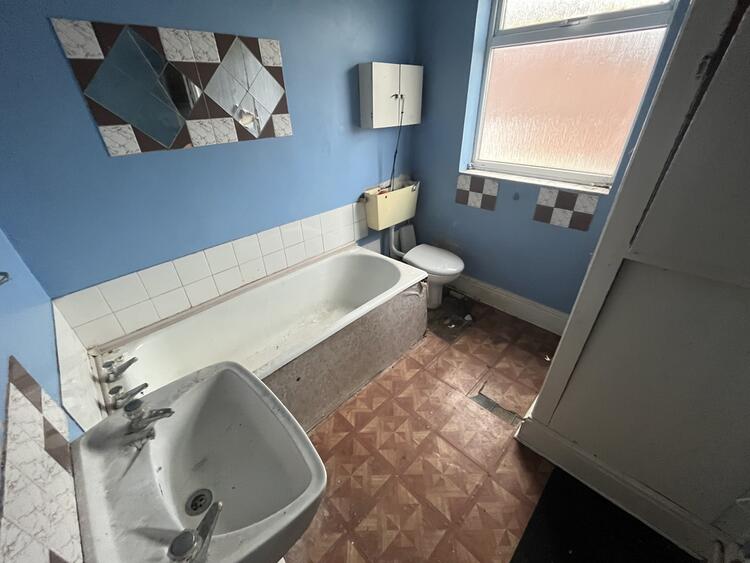 With low flush w.c. wash hand basin and panel bath. Airing cupboard, radiator and window to rear.