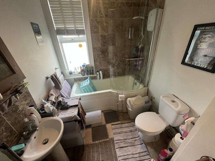 Having a modern suite comprising low flush w.c. wash hand basin and P shaped shower bath with shower over. Radiator and window to side.