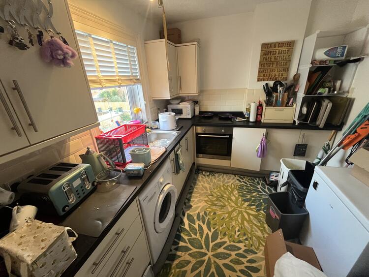 With modern base and wall units, sink, worktops, integrated oven and hob and window to front aspect.