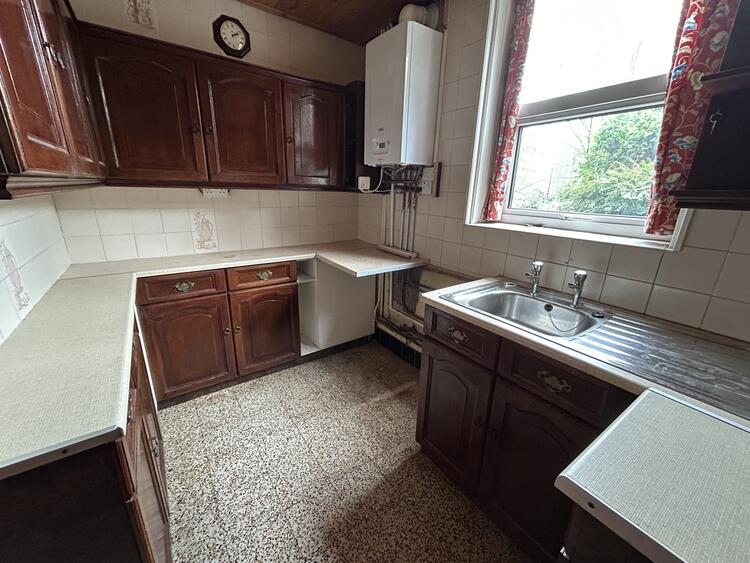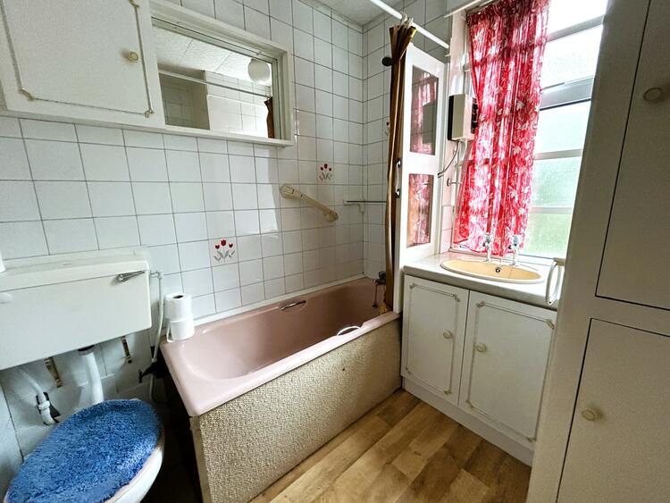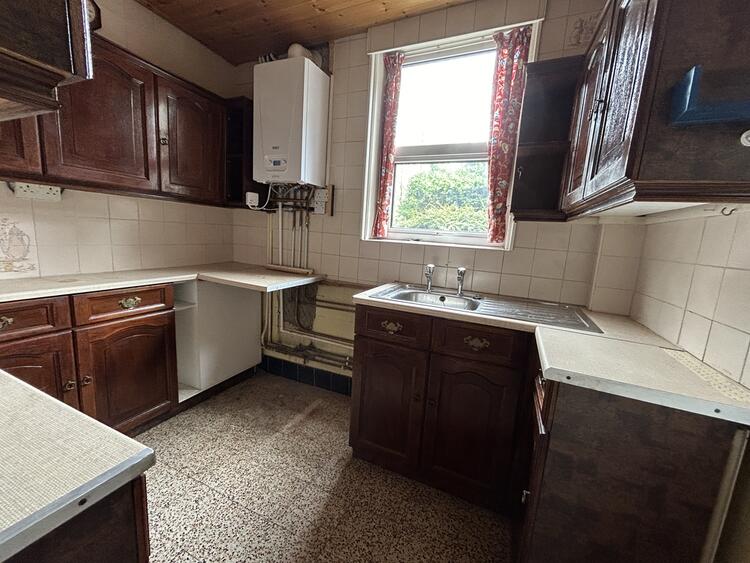 8ft 8 x 6ft 3 (2.64m x 1.91m). Fitted with a range of wood effect base cupboards, drawers and eye level units with work surface over incorporating a stainless steel sink drainer with splash back tiling. There is a gas cooker point, Terrazzo tiled flooring, UPVC double glazed window to the side and a half glazed door opens into the lobby. A recently fitted Baxi combi boiler serves the domestic hot water and central heating system.
