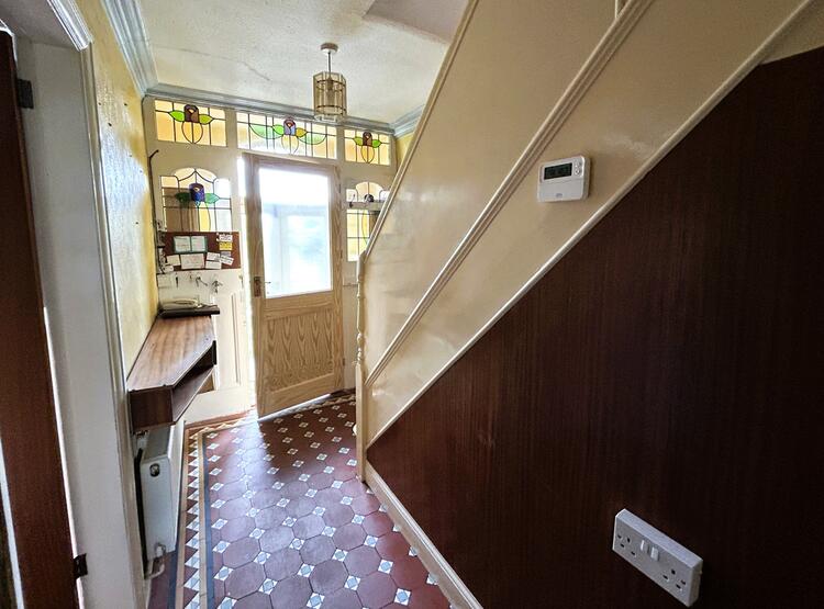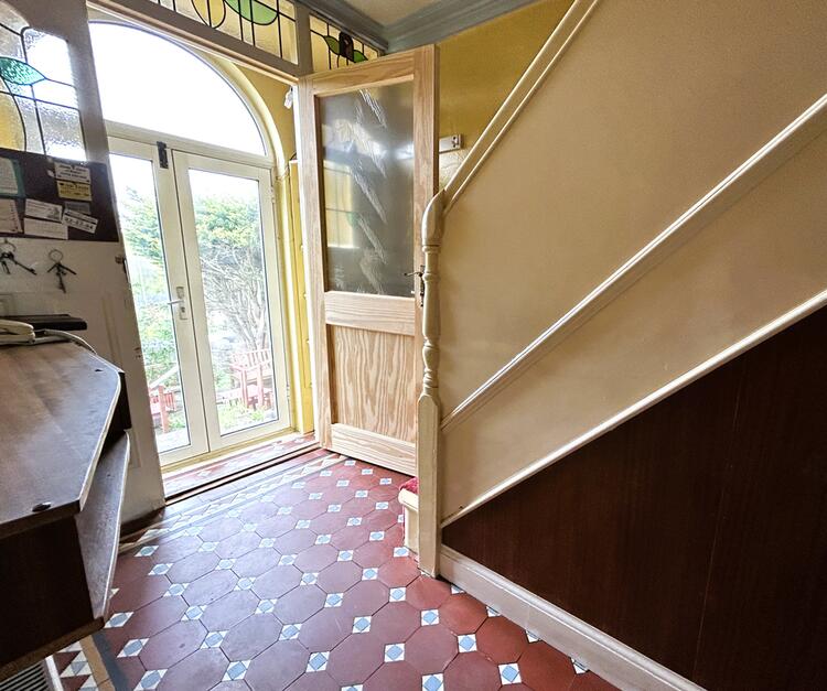 Having matching original Minton Tiled flooring, in-built telephone table, recessed mirror shelving, panelled staircase climbs to the first floor with useful under stairs pantry providing storage.