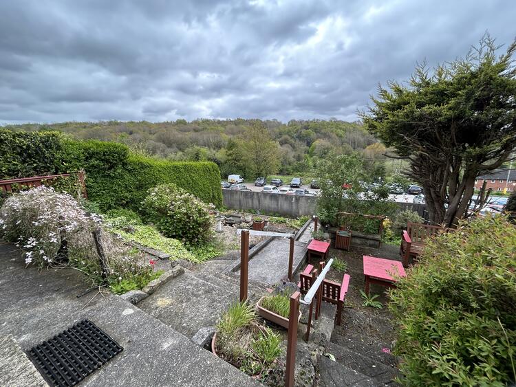 The property is accessed from The Coppice car park, off the Market Place via a pedestrian footpath leading to The Butts. The fore garden is terraced with a sunny seating area, perfect for alfresco dining and enjoying the views. A side garden is paved and provides access to the rear tiered garden, with a rockery and well stocked flower beds having mature trees, shrubs and flowering plants.