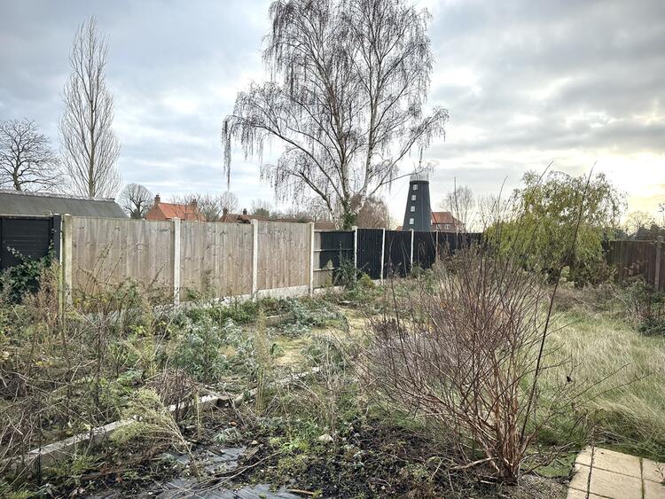 Fore garden, driveway and larger than average side and rear garden backing onto fields.