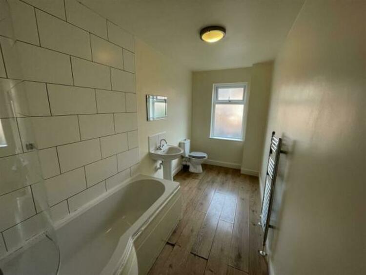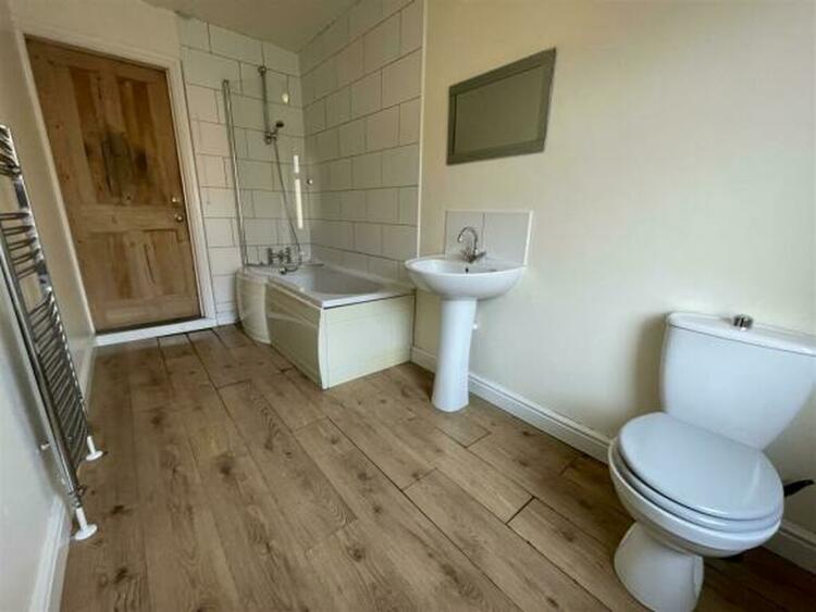 Bath with shower attachment, low level W/C, pedestal wash hand basin, heated towel rail, part tiled walls, double glazed frosted window to rear elevation.