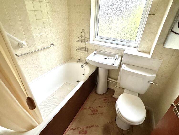 Partly tiled with a white suite comprising low flush WC, pedestal wash handbasin, bath with Triton shower over, central heating radiator and double glazed window to the rear.
