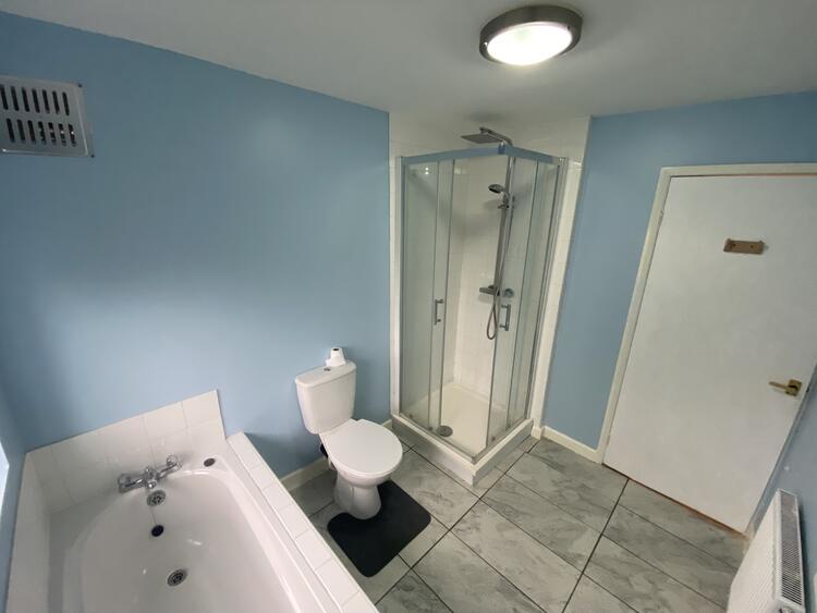 Incorporating a three-piece suite comprising low flush WC, pedestal wash hand basin, walk in mains powered shower with glass shower screen and bath. Part tiled walls, radiator and UPVC double glazed window to the rear aspect.